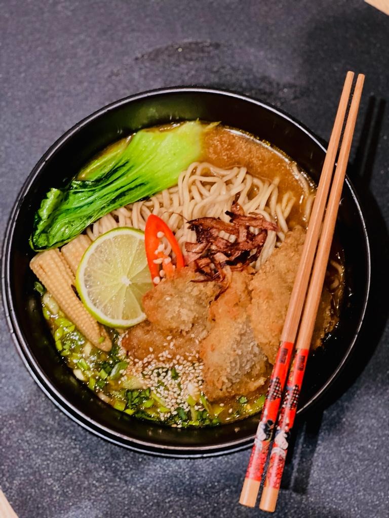 Bulion z grzybów shitake i konbu, kukurydzą baby, kiełkami fasoli mung, Boczniakiem w tempurze oraz pszennym makaronem ramen